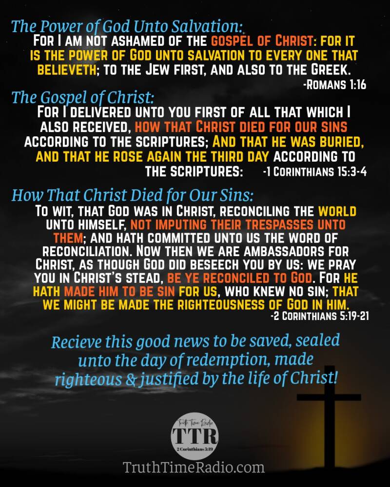 1 Corinthians 15:1-4, Acts 13:38-39; 26:18, 2 Corinthians 5:14-21, Romans 4:25; 6:4, Galatians 1:4; 3:13, Ephesians 1:7, Colossians 2:12